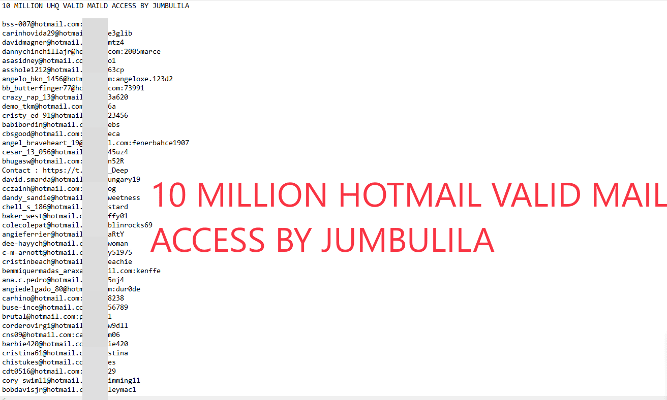 Warranty 1 days Lines 10000000 Country GEO Date of leak Sep 6, 2023 Website https://crax.shop/ Description: 10+ HOTMAILS VALID MAILS ACCESS BY JUMBULILA Screenshots: LEAVE A REVIEW FOR SUPPORT Reactions: Anoncana8, Steven and lehiep883