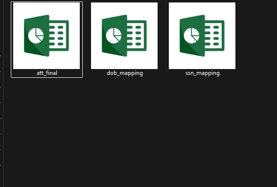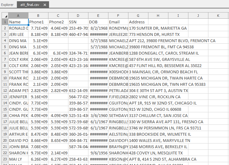 Columns: Name,Phone1,Phone2,SSN,DOB,Email,Address