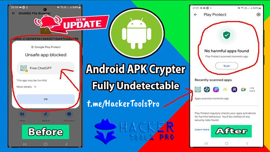 The t.me/ApkProtectHTP_Bot provides the facility of automatic Dropper, Bypass AntiVirus, Bypasses Google Play Protection that can help you to do your work more professionally. It is very easy to use it from telegram.