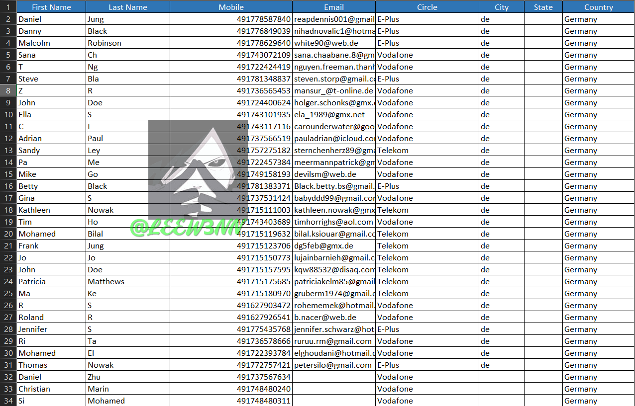 FIRST NAME+LAST NAME+MOBILE+EMAIL+CIRCLE+CITY+COUNTRY