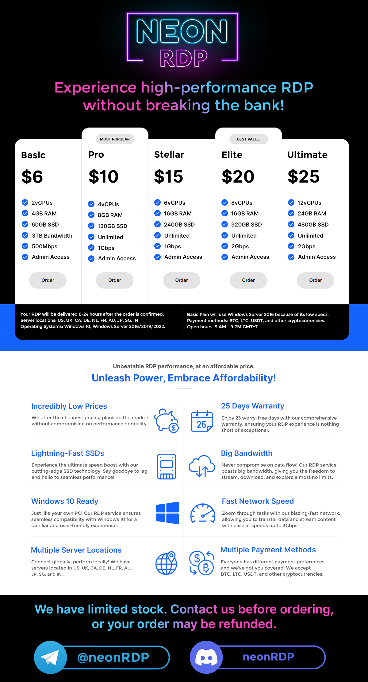 2. Your RDP will be delivered 1-24 hours after the payment received.