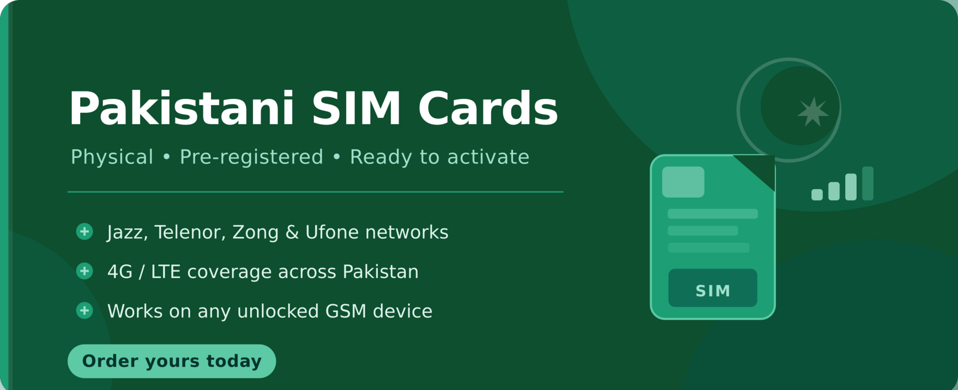 Whether you're traveling to Pakistan, sending one home to family, or setting up a local number for business, our SIMs come pre-registered and ready to activate on Pakistan's leading networks, including Jazz, Telenor, Zong, and Ufone.