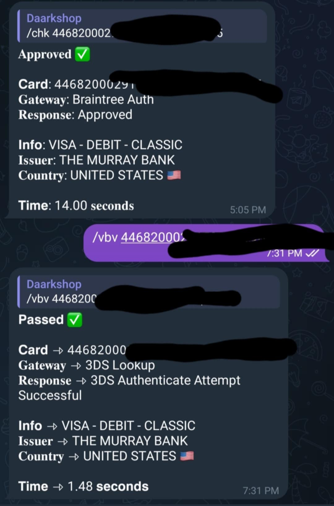 Warranty 1 days BIN 446820 Country Us Product Origin Stealer Daarkshop In All Good There Is A Little Evil, In All Evil There Is A Little Good t.me DaarkShopp Showcase Products Showcase t.me Private Non Vbv CC with $1000 Limit works on 3d gateways too No OTP contact me on telegram if you need any help Does not include Ssn and dob Screenshots: LEAVE A REVIEW FOR SUPPORT Reactions: govjor