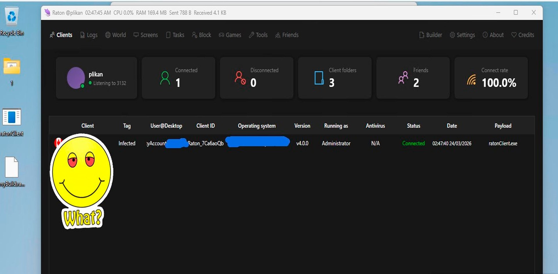 A remote access tool designed for remote administration between devices. Written in C#, the RAT itself has a unique visual interface and includes an SSL certificate, ensuring a secure connection between devices.
