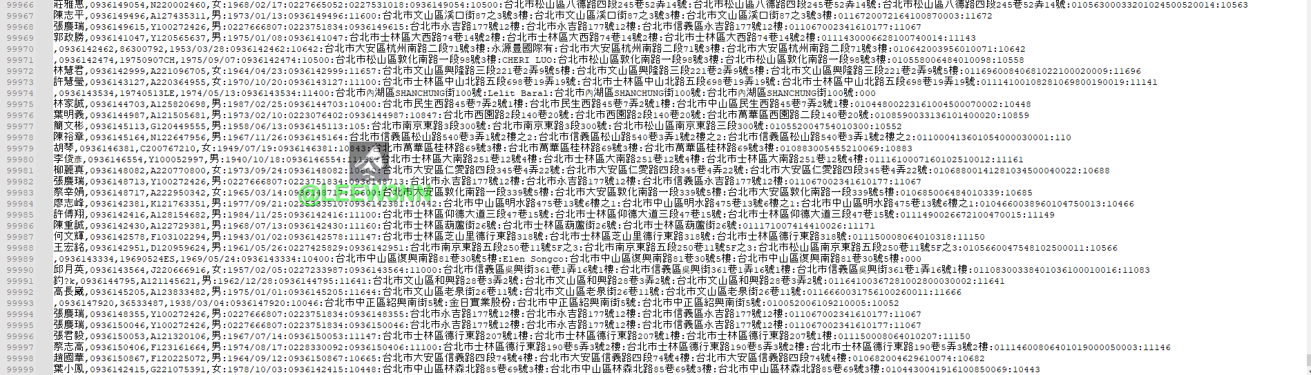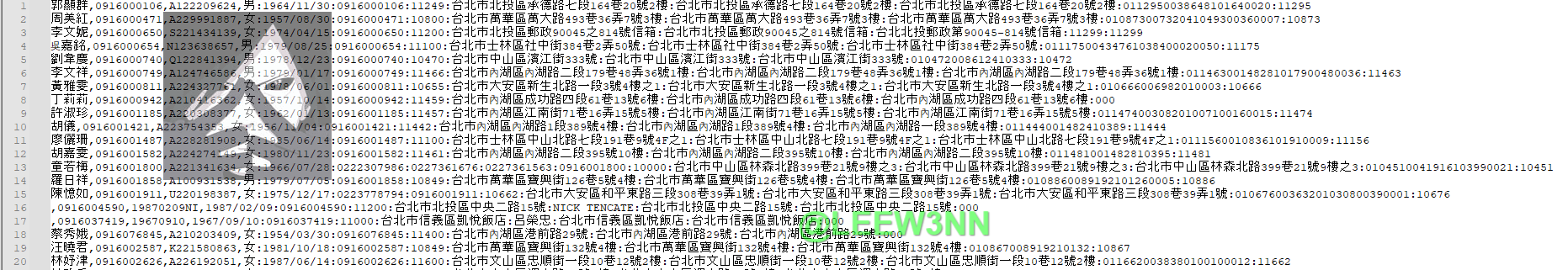 李文妮,0916000650,S221434139,女:1974/04/15:0916000650:11200:台北市北投區郵政90045之814號信箱:台北市北投區郵政90045之814號信箱:台北北投郵政第90045-814號信箱:11299:11299