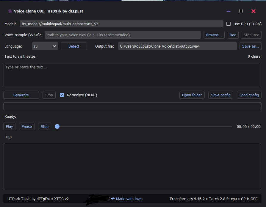 - Simple workflow: Pick or record a voice sample, paste your text, choose an output file, and click Generate.
